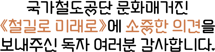 《철길로 미래로》 7+8월호가 무더위 속에서 찾아와 반가웠습니다. “이열치열로 여름을 즐겨보라”는 말에 제철 음식을 먹고, 계곡물에 발도 담가보라는 제안이 고마웠습니다. 가끔은 저를 위한 작은 보상이 필요했는데, 잡지를 읽으며 기운을 얻고 위로받을 수 있었습니다.