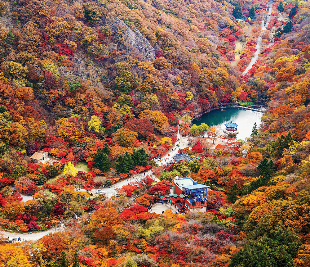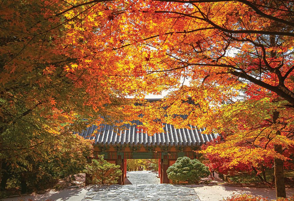 676년에 창건된 부석사는 우리나라 목조 건축의 걸작인 무량수전과 배흘림기둥으로 유명하다. 2018년에는 유네스코 세계유산 ‘산사, 한국의 산지승원’에 등재되며 그 가치를 인정받았다. 가을이면 경내를 둘러싼 단풍이 고찰의 고요한 분위기와 어우러져 더욱 깊은 울림을 준다. 돌계단과 기와지붕 사이로 흩날리는 붉은 잎들은 천 년을 버텨온 사찰의 시간과 겹쳐져, 한국적인 가을 정취를 가장 잘 보여준다.
