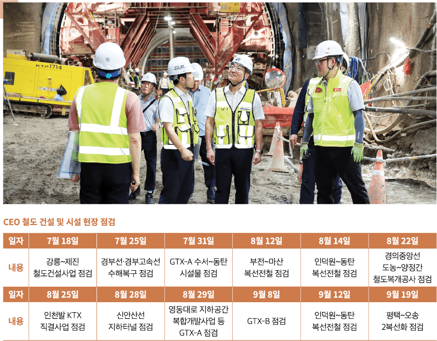 이성해 국가철도공단 이사장은 지난 7월 18일 강릉~제진 철도건설사업 교량 및 터널공사 현장을 방문해 집중호우 대비 현장 안전관리 실태를 점검했다. “연일 폭우가 지속되는 가운데, 유사시 신속한 대응을 위해 비상연락체계를 적극 유지하고 현장 순찰을 강화해 주기 바란다”며, “집중호우로 인한 피해가 발생하지 않도록 응급복구 장비·자재·인력을 사전 배치하고 배수시설을 수시로 점검하는 등 현장 안전관리에 만전을 기해달라”고 당부했다. 지난 7월 25일에는 집중호우로 선로 침수와 사면 유실 피해가 발생한 경부선 전의~전동 및 경부고속선 천안~오송 구간의 수해복구 현장을 방문해 긴급보수 작업 현황 점검에 나섰다. 이 이사장은 “국민들이 안심하고 철도를 이용할 수 있도록 향후 본격적인 복구공사도 신속하고 안전하게 추진해 주기 바란다”며, “최근 빈번히 발생하는 국지성 호우에대비해 선제적 예방 조치를 강화하고 현장 안전관리에 만전을 기해 달라”고 당부했다.