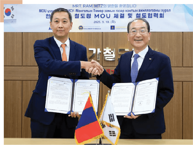 국가철도공단은 지난 9월 18일 몽골 철도청과 철도 분야 협력 강화를 위한 양해각서(MOU)를 체결했다. 몽골 철도청은 러시아·중국에 대한 의존도를 줄이고 독자적인 철도 발전을 추진하기 위해 올해 1월 몽골 도로교통부 산하에 신설됐으며, 정책 수립·건설·운영·안전관리 등 철도 전담 기능을 수행하고 있다. 이번 협약을 통해 양 기관은 철도건설· 운영, 신기술 도입, 법률 및 표준 제·개정, 전문인력 양성 등 지속 가능한 몽골 철도 발전을 위한 협력체계를 구축하기로 합의했다. 특히 울란바토르~하르호롬 고속철도 건설사업 타당성 조사, 바가항가이~후시 그 헌디 철도건설, 관제센터 신호통신시스템 개발·구축 등 주요 사업을 공동으로 추진할 예정이다. 이성해 이사장은 “이번 협약은 몽골 철도의 자립과 K-철도의 글로벌 위상 강화를 동시에 이끌어 낼 중요한 계기”라며, “현지 표준 및 기준 제·개정에도 적극 협력해 우리 철도 기술이 몽골에 안정적으로 진출할 수 있는 토대를 마련하겠다”고 밝혔다.