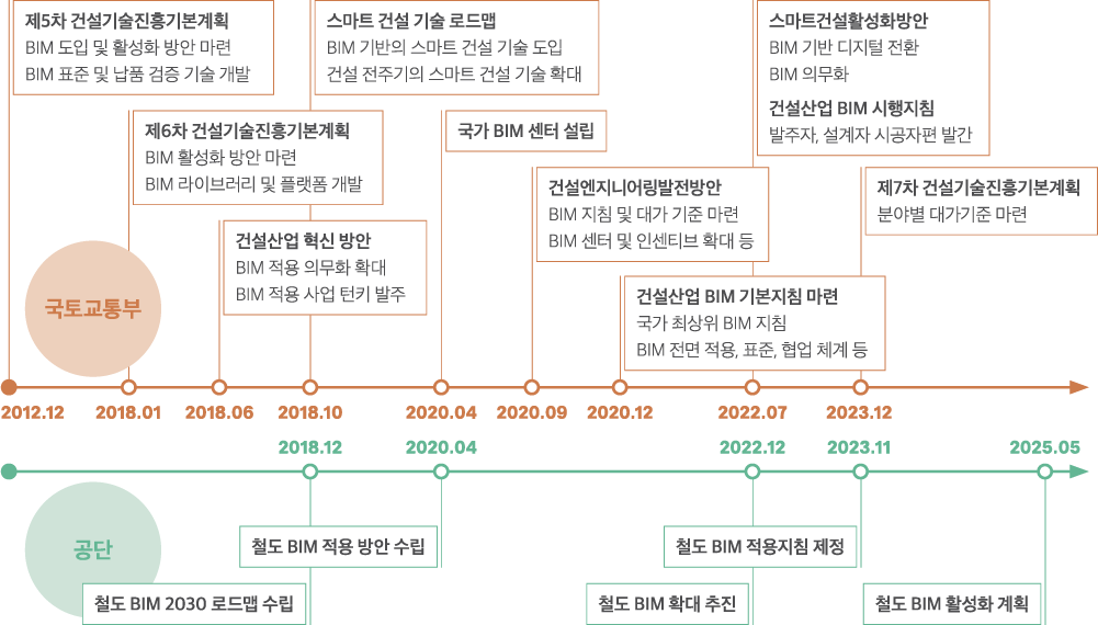 국토교통부는 2010년 초반부터 BIM 도입을 위한 계획 및 전략을 수립해 왔다. 「건설산업 BIM 기본지침(2020.12)」과 「건설산업 BIM 시행지침(2022.7.)」을 마련했으며, 정책적으로는 건설 전 과정의 디지털 전환을 위해 1,000억 원 이상 공공공사에 대해 2023년부터 BIM 도입을 의무화했다. 이에 따라 국가철도공단, 한국토지주택공사(LH), 한국도로공사 등 발주청은 실제 업무 프로세스를 고려한 BIM 적용 지침을 마련했다.
