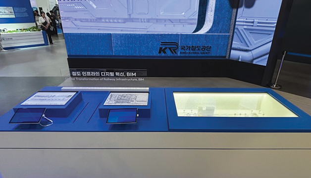 지난 6월, 부산에서 열린 ‘2025 부산국제철도기술산업전’ 국가철도공단 부스에서 체험형 콘텐츠의 일환으로 ‘BIM AR on Table’을 전시했다. 관람객은 직접 태블릿을 사용해 CAD(2D) 도면 위에 BIM 모델(3D)이 겹쳐지는 모습을 체험할 수 있다. 전주역, 남한강교 같은 친숙한 철도시설물을 활용해 기존 CAD(2D) 접근 방식과 BIM 모델을 비교함으로써, BIM의 시각화 효과 등 건설 관리에 활용 시 얻을 수 있는 이점을 관람객이 쉽게 파악할 수 있도록 했다.