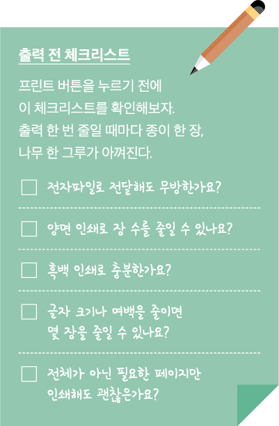 회의 자료, 보고서, 안내문 등을 출력하기 전, 이 문서가 꼭 종이로 있어야 하는지 생각해보자. 단순한 습관처럼 눌렀던 인쇄 버튼도, 잠깐 멈추면 줄일 수 있다.