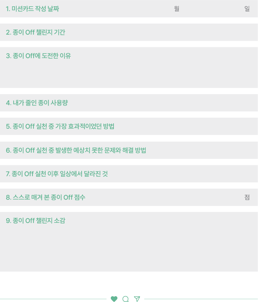 가능한 한 적게 쓰고 다시 쓰는 방향으로 바꿔보자. 한 장 한 장의 쓰임을 늘리는 것만으로도 꽤 큰 변화가 만들어진다. - 메모는 다시 쓰고, 지워 쓰기 한쪽만 사용한 A4용지는 메모지, 인쇄 테스트용, 초안 작성 등에 다시 활용할 수 있다. 자주 쓰는 메모는 작은 화이트보드나 유리창 메모, 클립보드에 낀 이면지 등 지우고 다시 쓸 수 있는 도구로 바꿔보자. 종이를 덜 쓰는 가장 쉬운 시작이다.