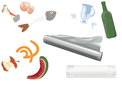남은 음식물 | 음식물 전용 수거함에 배출※ 과일 씨·조개 껍데기·생선 뼈·채소 뿌리·껍질 등은 알루미늄 호일 | 일반 쓰레기 비닐랩 | 일반 쓰레기 깨진 유리 | 재활용 불가, 종량제 봉투에 담되 종이로 감싸 안전하게 배출※ 일반 유리도 재활용 불가, 종량제 봉투 배출