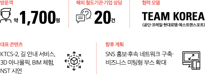 이번 참여를 통해 공단은 UAE 고속철도사업 입찰 경쟁력 강화는 물론, 중동·중앙아시아 철도시장과의 협력 기반을 넓히는 교두보를 마련했다. 또한 해외 전시 경험을 통한 글로벌 홍보 역량 강화와 K-철도의 브랜드 가치 제고 효과도 확인되었다. 이를 바탕으로 외국 기관들이 선호하는 대형 미팅룸과 다과 공간, 간접 조명 중심의 프리미엄 디자인을 도입해 사업 상담 중심의 부스로 진화시킬 예정이다. 아울러 분야별 전문 인력을 현장에 배치해 글로벌 비즈니스 협력 기반을 강화할 방침이다.