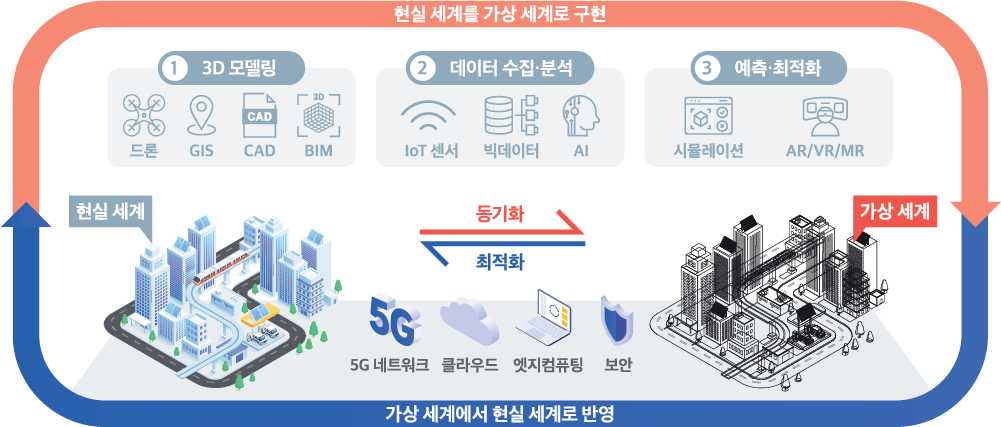 디지털트윈은 현실 세계를 가상으로 거의 똑같이 구현하는 기술을 말한다. 현실의 공간, 시설물, 시스템 등을 가상세계에 그대로 구현하기 때문에, 현실에서 발생할 수 있는 여러 상황을 가상 세계에서 재현하여 어떤 변화가 생기는지, 무엇을 해야 할지 등의 정보를 얻을 수 있다.인구 고령화, 시설물 노후화, 급격한 기후변화 등 사회가 빠르게 변하면서 불확실한 미래에 대비하기 위한 노력의 일환으로, 전 세계적으로 여러 분야에서 디지털트윈 기술 도입이 활발히 이루어지고 있다.