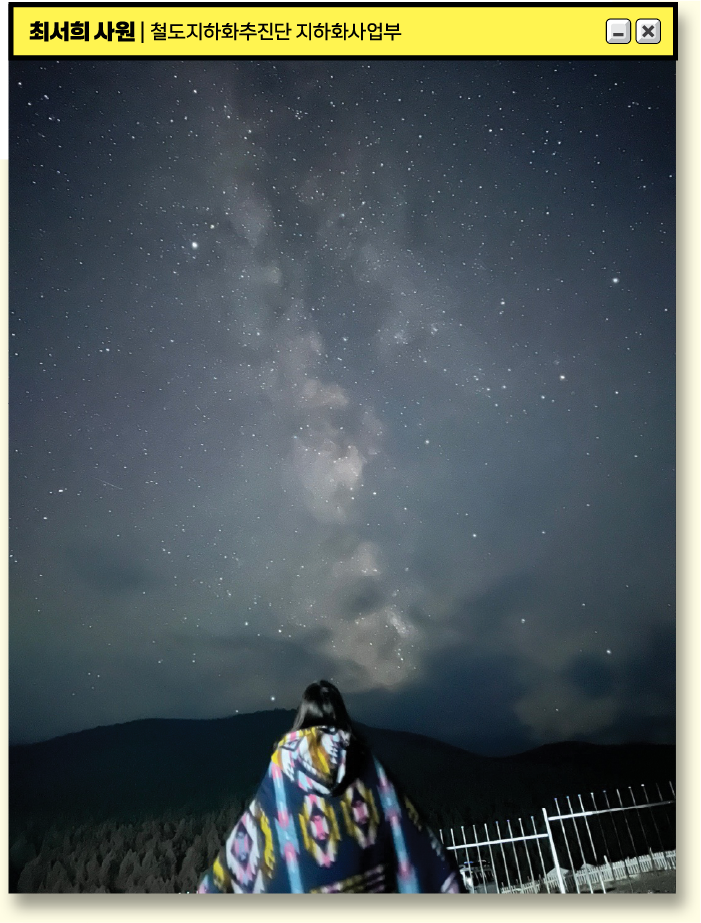 광활한 몽골 대지에서 만난 은하수는 올해 가장 기억에 남는 장면입니다. 밤하늘 가득 펼쳐진 별들의 궤적은 우리가 쉴 새 없이 놓아온 철길이 마침내 닿은 가장 아름다운 종착역처럼 느껴졌습니다. 이 사진은 철도를 통해 세상을 연결하고, 더 넓은 곳을 꿈꾸는 우리의 앞날과 닮았습니다.