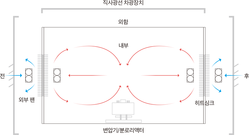 신기술의 핵심은 ‘외부 공기 유입 없이 어떻게 열을 식히느냐’에 있다. 공기가 드나들지 않는데 열을 내보내는 비결은 바로 금속을 타고 이동하는 ‘열전도’ 원리다. 열 전도성이 뛰어난 알루미늄 소재로 ‘양면형 압출 히트싱크’를 제작해 외함 벽면에 설치한다. 단순히 금속이 열을 전달하는 것에 그치지 않고, 내부와 외부에서 공기를 강제로 순환시키는 ‘대류’ 현상을 결합했다. 외함 내부의 뜨거운 열기를 히트싱크의 촘촘한 핀(Fin)으로 전달하면, 이 열이 금속을 타고 밖으로 넘어가 외부 공기와 만나 식는 원리다.