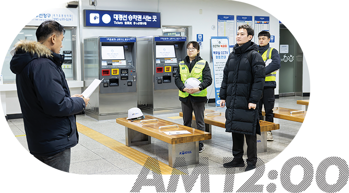오후 11시 40분. 공단 사람들이 하나둘 왜관역에 도착했다. 시설물검증시험 시작을 알리는 자정, 영남본부 안전품질부 김훈재 차장이 참여한 모든 사람들을 대상으로 안전 교육을 실시했다. 졸음운전 방지를 위한 휴식 안내부터 ‘2인 1조 이동 준수’라는 철저한 원칙까지 안내했다. 시설물검증시험은 국가철도공단이 지은 시설을 운영 주체인 한국철도공사에 완벽하게 인수인계하기 위한 작업이다. 안전 교육을 끝마친 후 동대구역에서 출발한 열차를 타고 북삼역으로 가기 위해 역 플랫폼으로 이동했다.